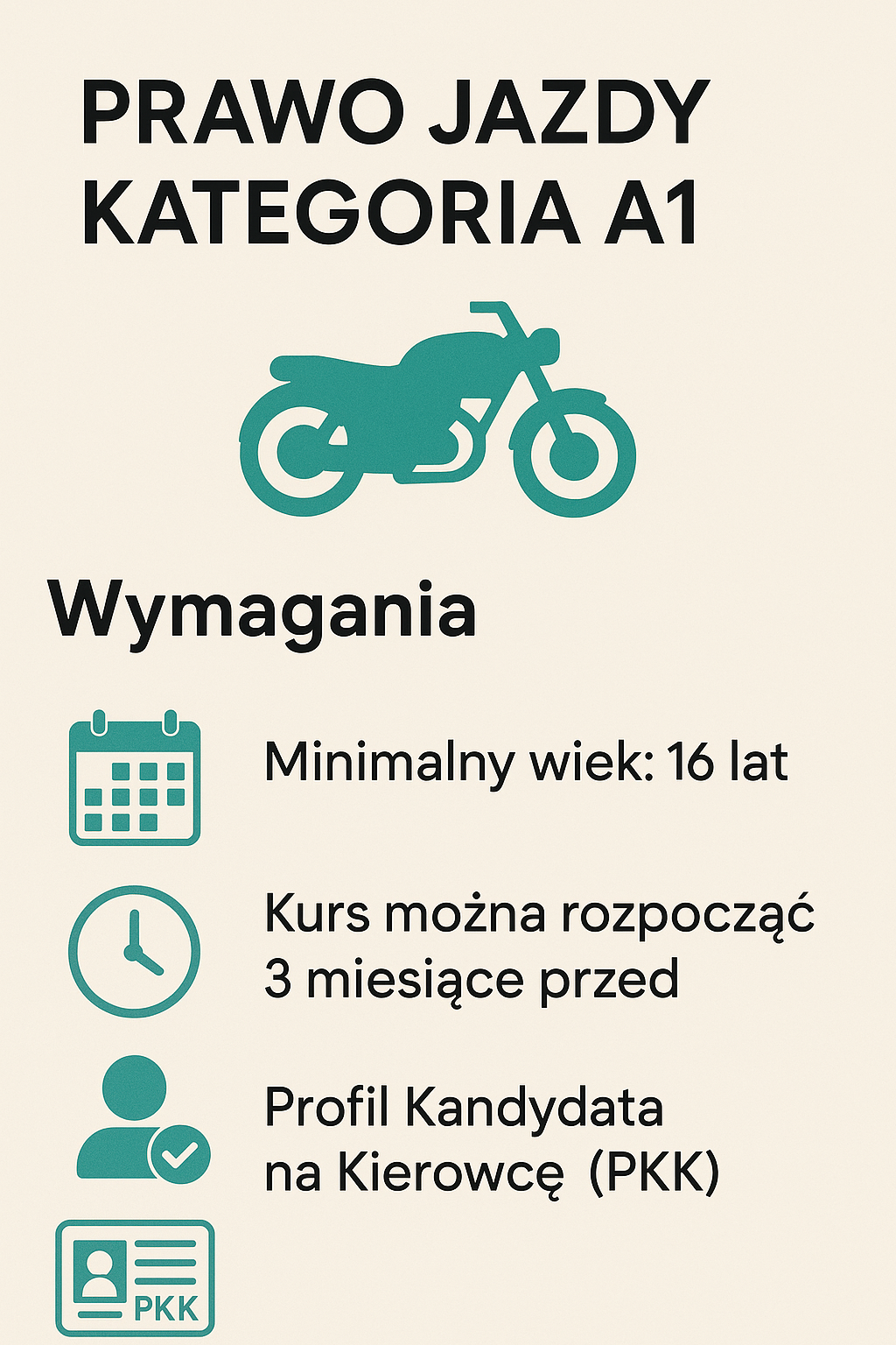 Prawo jazdy kategorii A1 pozwala na kierowanie lekkimi motocyklami od 16. roku życia. Jest to krok pośredni między kategorią AM a kategorią A2/A.